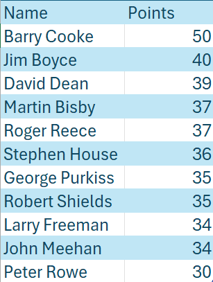 The Tuesday Afternoon Club league table as at 26th August 2025